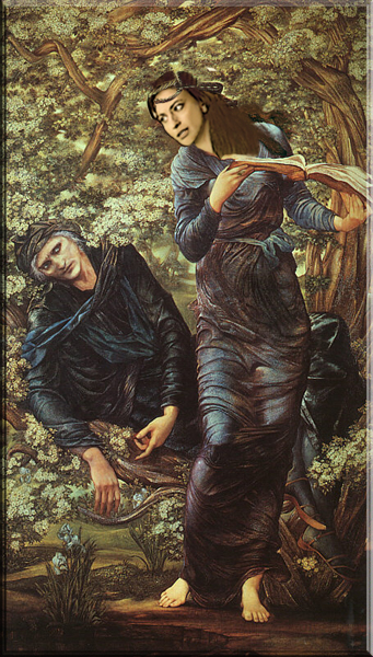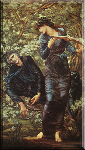 The Beguiling of Merlinby Sir Edward Coley Burne-Jones The legends are many and various. Basically, Merlin was so enamoured by Vivien, 'The Lady of the Lake,' that he agreed to make her mistress of all his mystical powers. Twit! She then imprisoned him in the Glass Tower where he lies in eternal sleep. In Welsh, Vivien, or Vivienne is known as Nimuë, and Merlin as Myrddin. Geoffrey of Monmouth changed that name because he thought it sounded too close to «merde » ::rolls eyes:: |